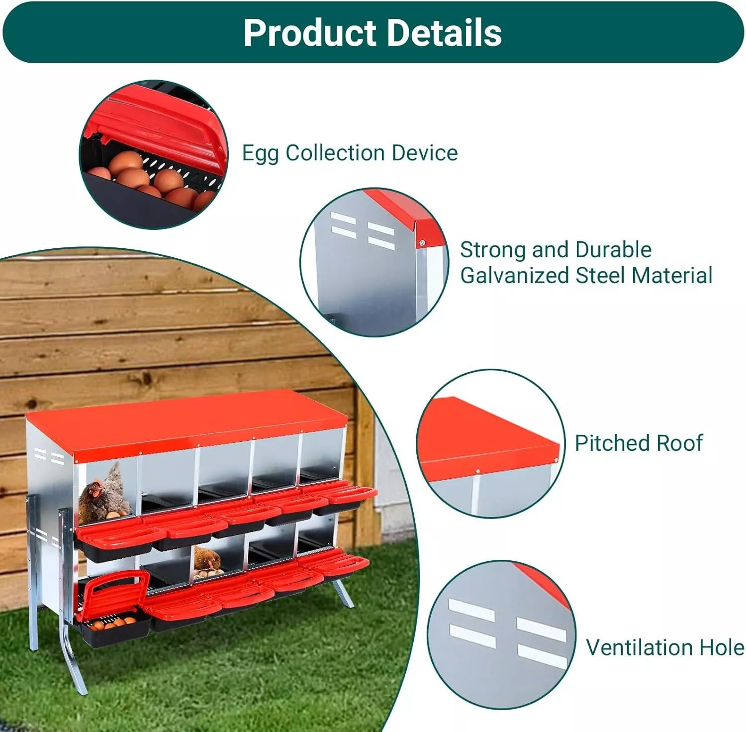 This 10-compartment Chicken Nesting Box includes a Roll Away Egg Coop, providing a convenient and efficient solution for collecting and protecting freshly laid eggs. Crafted with expert design and made of high-quality materials, this nesting box is the perfect addition to any poultry farm or backyard chicken coop.
